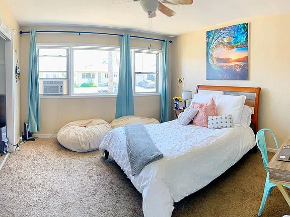 Other features include vinyl plank flooring throughout bedrooms/living room, every two rooms have an adjoining bathroom, making it for easy for sharing, plus new ceiling fans, preinstalled AC units, new window treatments and newly updated washer/dryer. 4 parking permits but must apply with lease on cityofSD website. House is spacious and perfect for a large group of ~7 (middle room is usually a double).