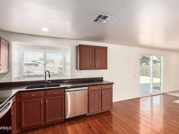 Welcome to this thoughtfully designed residence offering 1,389 sq. ft. of well-planned living space. Inside, you'll find sleek wood-look laminate flooring throughout and a practical floor plan that flows easily from room to room. The kitchen boasts granite countertops, a pantry, and plenty of cabinetry, while the spacious primary suite features a walk-in closet and private access to the covered patio. Step outside to enjoy the expansive backyard with pavers, a travertine path, low-maintenance landscaping, and a fenced pool perfect for Arizona living. Nestled in a quiet cul-de-sac with no HOA, yet just minutes from shopping, dining, and entertainment!