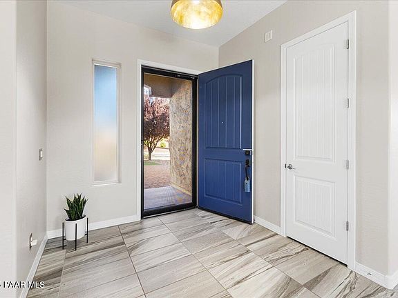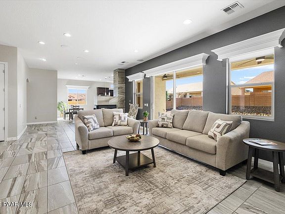 ONE-OF-A-KIND, MODERN STUNNER - Spotless and set on a coveted cul-de-sac, this highly upgraded Granville home is a stylish showplace you'll be proud to call home. The split floorplan offers 4 bedrooms/2 baths and makes excellent use of all 2,334 square feet. Greet your guests with an upscale paver driveway and a charming paver patio at the entry -a bonus outdoor space to relax and enjoy a breeze. With a striking accent wall and tile, dramatic cornice boxes, and unique 3-sided fireplace, the central living space is a ''wow'' and the perfect place for entertaining or memorable family time. The bright kitchen stars an expanse of staggered espresso cabinetry with mood-enhancing underlighting, complimented by an on-trend tiled backsplash, coordinating granite countertops, and eye-catching pendant lights. The corner pantry, Samsung FlexZone refrigerator, soft-close cabinets, gas range, and undermount sink set in a large island are practical and handy for the cook in your family. Stretch out and unwind in an enormous primary bedroom, enhanced by a classic bay window. The sharable ensuite with TruStone detail offers dual sinks in separate raised vanities, an enclosed shower with dual showerheads, a spacious walk-in closet, and a Solatube skylight to bring in beautiful, natural light. Lighten your workload in a laundry room with enhanced cabinetry, counterspace, and a Samsung washer & dryer set. A water softener adds comfort while protecting plumbing and appliances. Spend your free time in an easy-care backyard paradise: throw a party and watch the big game on the covered patio's TV while the kids romp on the durable synthetic lawn. Store tools and toys effortlessly in the sturdy utility shed. Extra room for parking or hobbies in the 25-foot-deep 3-car garage. Quality construction: 2x6 exterior framing, post tension foundation, 10-foot ceilings, and 8-foot doors. Granville's extensive community amenities are included in a very reasonable HOA fee. A location that's convenient to all the best of Prescott Valley - plus easy access to Highway 89A - add the perfect finishing touch.