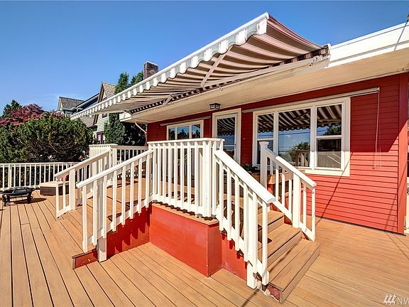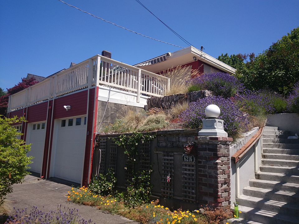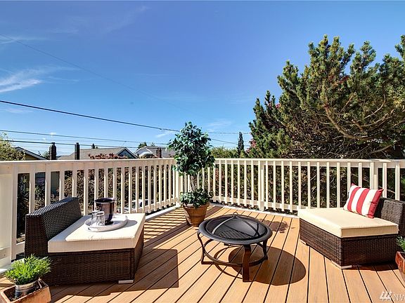 Lavender lined curved stair leads you to a fabulous westerly view from 800 sq ft deck on Phinney Ridge! Sunny bright home is ready for 2nd floor addition.2 beds & 2 baths up, 1 down w/ 2nd fireplace bedroom or family rm. Great potential for lower level MIL,ext.entrance. Fresh paint, wood, carpet & vinyl. Remodeled kitchen, private mature terraced gardens, patio & fruit trees all add to this home's allure. Awesome spacious 3 car garage.Walk score: 79, stroll to Greenwood, Woodland Pk, Ken's Mrkt.