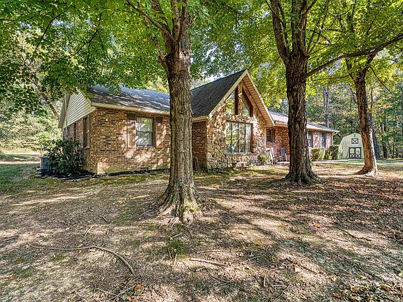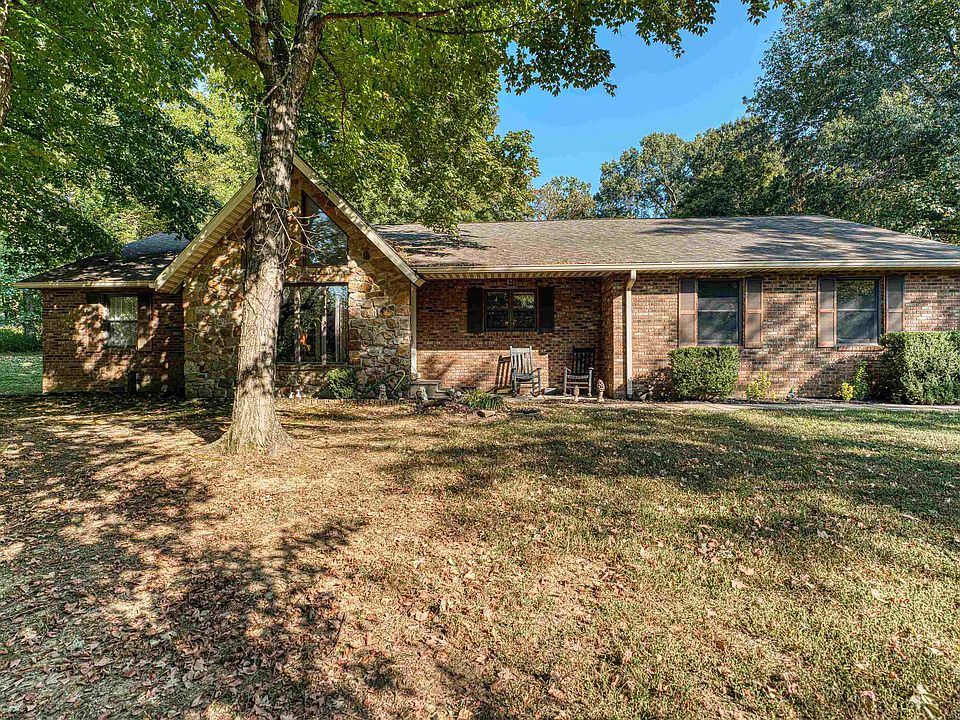Enjoy the best of country living in this beautifully maintained all-brick ranch-style home featuring 3 bedrooms, 2 baths, and a spacious 2-car garage. Nestled on 2.86 acres, this property includes a serene lake stocked with catfish galore — perfect for peaceful afternoons or weekend fishing. Inside, you'll love the split floor plan, ideal for privacy and functionality. The oversized kitchen has an abundance of oak cabinetry, solid surface countertops, and a convenient serving bar that flows seamlessly into the dining area and large living room with a cozy gas log fireplace. The vaulted ceiling entryway creates a grand first impression. The owner’s suite offers direct access to a sunroom — a perfect spot for a hot tub or your morning coffee — while the back patio invites you to relax and enjoy the quiet countryside. Additional features include: Geothermal HVAC system for energy-efficient comfort Owned propane tank that conveys with the property 12x12 storage building with loft 20x24 carport with metal roof and sides Connexon internet available This is a rare opportunity to own a move-in-ready home with land, water, and amenities already in place. Schedule your private showing today!