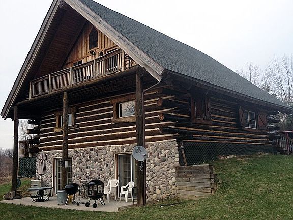 Rare opportunity to buy a log home built by the owner on 15 waterfront acres bordering Harris lake 1 mile to Lake Michigan in Southwest Michigan. Currently a year round vacation rental on VRBO & Airbnb with over 200 5 star reviews. Also located on the property is a Tipi & vintage camper and school bus that is rented during the summer months with and separate from the house. Property is very private and wooded close to everything in SW Michigan 90 minutes from Chicago 2 hrs. to Detroit. Price includes small tractor with front loader. Zillows estimated value is low and inaccurate.