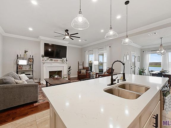 LIKE NEW 3 bedroom, 2 bath home located on a WATERFRONT LOT in highly desirable Pelican Crossing! Open and split floor plan. The chef’s kitchen has painted custom cabinets, slab quartz countertops, stainless steel appliances, gas range, large center island with breakfast bar, and separate pantry. The kitchen and dining rooms are open to the living room, which overlooks the water and has a gas log fireplace with quartz surround, and triple crown molding. The spacious master bedroom features an en suite bath with soaking tub, separate shower, dual vanities with quartz countertops, framed mirror, separate water closet, and large walk in closet. Wide-plank wood flooring throughout living room, porcelain tile in kitchen and both baths, and carpet in all bedrooms. The backyard is fully fenced and includes a covered patio, open patio, fire pit, and amazing views of the water! Perfect for entertaining! Other energy efficient features include Rheem tankless gas water heater, low E tilt-in windows, and radiant barrier roof decking. Close to great restaurants and shopping, with convenient access to I-10. Call me today to schedule your private tour!