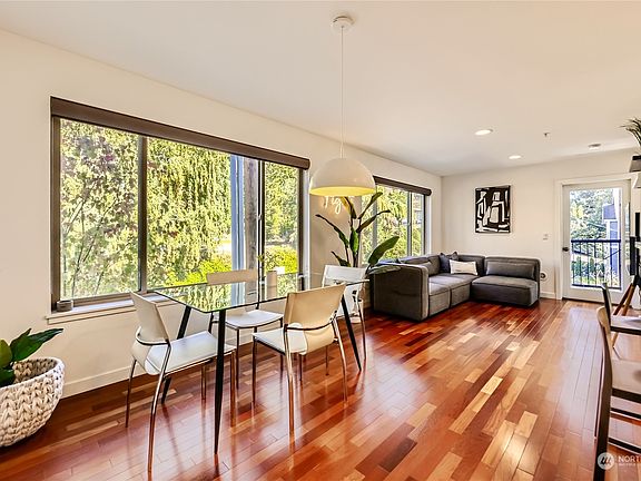 Immaculate and like-new open-concept condo with sleek modern cabinetry, stainless appliances, quartz counters, and hardwood flooring. Enjoy morning coffee on the balcony off the living room or venture to the building’s roof-top deck to take in incredible views of Lake Washington and neighboring hills. Two bedrooms and baths, including primary with en-suite, in-unit washer and dryer, dedicated parking space, and bike storage. Abundant windows and generous recess lighting keep it bright! Commuters dream with excellent transit and equal distance to I-5 and 405 for easy access to outdoor adventures and metropolitan hubs. Burke Gilman Trail just across the road and great shopping and restaurants in nearby Lake Forest Park and Downtown Bothell.