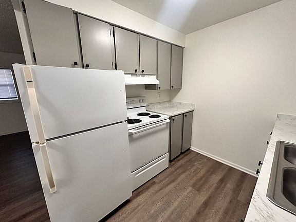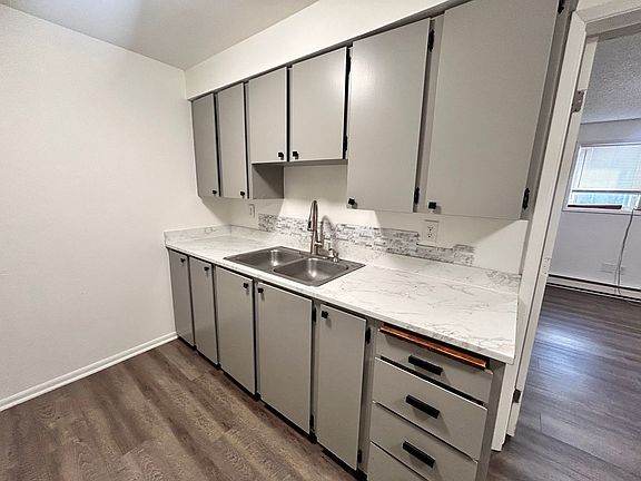 Off-street parkingImpeccably updated kitchenModern gray cabinetryStylish lvp flooringDeep double-kitchen sinkGround floorWalk-in closet