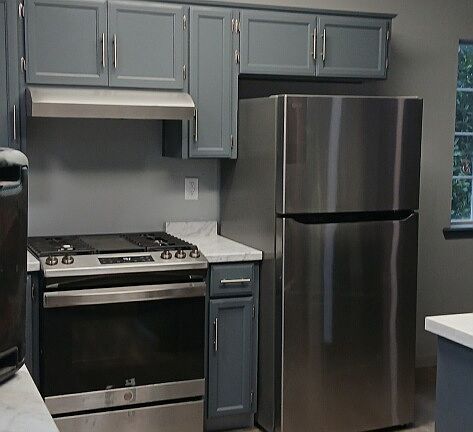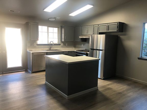 Upgrades include new paint inside and out, new interior and exterior doors, new faux wood floors throughout, new light fixtures and all new kitchen appliances. Stove is gas. Small kitchen island. French doors lead to back deck. Large separate laundry room has hook ups for your washer and dryer.