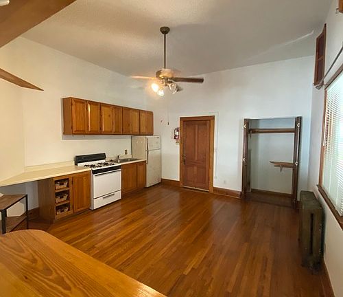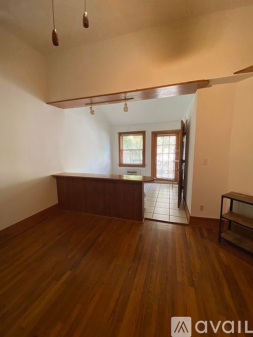 This cozy studio apartment combines rustic charm with practical features. The space offers warm hardwood floors throughout and high ceilings that make the unit feel open and airy. A ceiling fan provides extra comfort, while large windows bring in plenty of natural light.