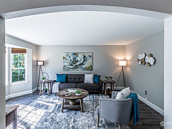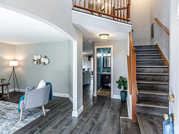 This remodeled 3-bed, 2.5-bath home sits on a 1/4-acre corner lot, close to the Town of Steilacoom & the sea. This property offers an ideal setting for relaxed, stylish living. The exterior features a large fenced yard with mature fruit trees, providing both beauty and privacy. A spacious deck with a hot tub is perfect for outdoor entertaining or unwinding after a busy day. Inside, the home welcomes you with a formal living room & an open concept rec-room/dining/kitchen area, creating a versatile space for everyday living. The kitchen, updated with modern appliances, serves as the heart of the home. The primary bedroom is a private retreat, featuring an en-suite bathroom & a spacious walk-in closet. Close to freeways, shopping and schools.