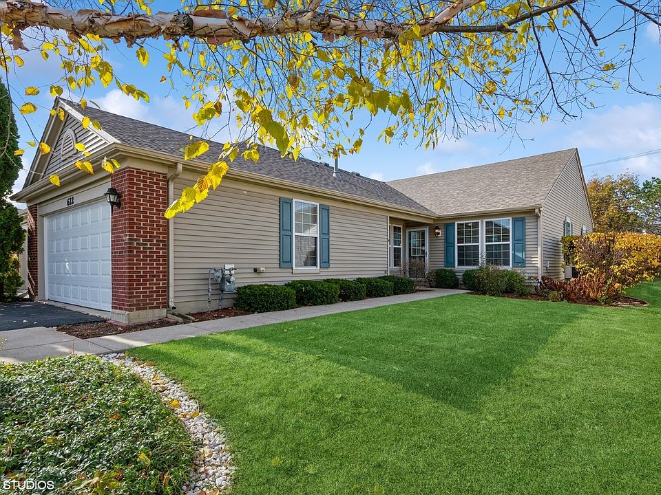 This is it! One-level, no steps, first floor, ranch-style, end unit, townhome in the desirable 55+ community of Bradford Place. Two spacious bedrooms, with brand new carpeting, along with two full bathrooms. The primary bedroom is en suite with an ample sized walk-in closet. Generous ceiling height and wide hallway with plenty of windows give this end unit an open and roomy feel. The interior was just professionally painted in a wonderfully neutral color. Attractive wood laminate flooring stretches from the front to the back of the home. There is a living room, formal dining room with a pass through to the eat-in kitchen and a den/office/family room with access to private back patio and grassy area. The laundry room off the kitchen has a large closet that can double as a pantry. The 2 car attached garage is extra deep on one side providing ideal space for a workbench and/or additional storage. This lives like a single family home. Great location not far from downtown Grayslake.