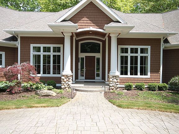 Custom Builders Personal home, built on 4.16 acres with over 5600 square feet is located on a private drive with no association fees (just a joint driveway maintenance agreement between 3 homes). Site is large enough for an out-building or barn with horses. The gorgeous interior includes an open kitchen with eating area, walk-in pantry, owners suite with private porch, formal dining room, great room with fireplace, foyer, music/reading room, laundry room, two half baths, home office with private entrance, two stairways to the lower level that has three bedrooms and two baths, exercise room or another bedroom, family room with fireplace and entertainment center, custom built bar, and carpeted fully finished storage area. Home also features a large 3-stall main garage with a basement garage below, security system, underground gas and electric and new Automatic Back-up generator. Heated flooring in master bath, 2 high-efficient furnaces (one for lower level, and another for the main level with two zones for comfort) and central air. Students can attend F. H. Northern or Eastern High Schools. New coat of asphalt July 2021.