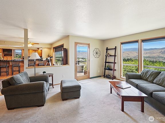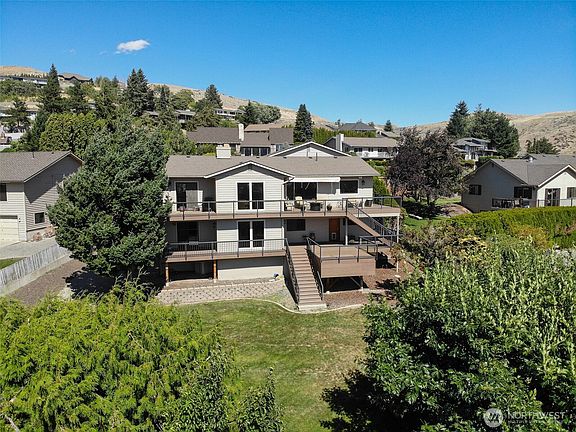 VIEW-the ability to see something. That is what this home offers- the ability to 'see' mountains, sky, city lights, Mission Ridge, river..180 degrees of 'views', starting at the foyer- the wall of windows, flanked by wrap around 2-level view deck! Kitchen offers plenty of storage, pantry & peninsula seating. Living room w/ wood burning fireplace. Primary suite w/slider to deck-nice separation of space in the attached bathroom & wardrobe closet. Lower level: 3 bedrooms, updated full bath & large rec room w/wet bar & fireplace. Built in desk/craft area in utility room. Home might need some updates here & there- worth it, to take advantage of the versatile floor plan and oh did I mention the VIEWS! Park-like fenced backyard, with easy access.