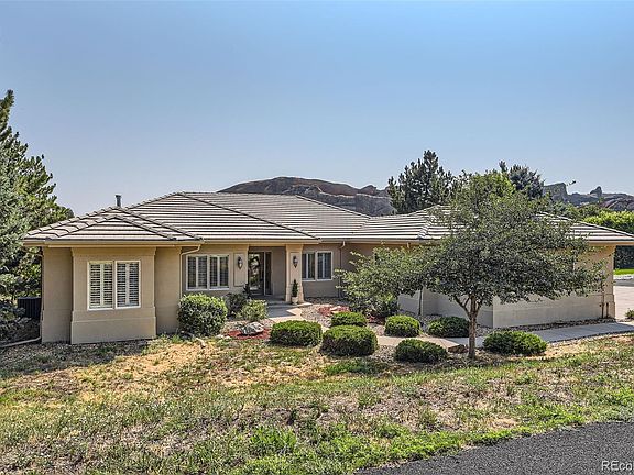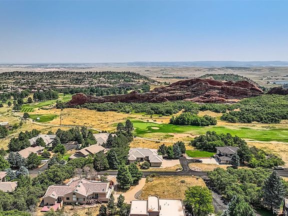 This magnificent home is nestled up high in Roxborough Park and backs to the 16th green of the highly acclaimed Arrowhead Golf Course. The amazing setting includes unbelievable panoramic views of open space, red sandstone rocks, and wildlife. This ranch style home has hardwood floors in the entry, kitchen, dining and great room. The kitchen features custom Schroll cabinetry, slab granite countertops, an island with seating plus a separate food prep island, all stainless appliances and a range hood above the stove. A two-sided gas fireplace with stone surround separates the eating space in the kitchen and the great room. The high ceilings and tall windows enhance the beautiful views and open feel. There is also a formal dining room adjacent to the kitchen. The main floor primary bedroom is spacious and has a seating area with more views, a 5-piece bath and walk-in closet. Two more bedrooms, a study/office with glass doors, a full bath with dual vanities, a half bath with a pedestal sink, and laundry room that can also be used as a butlers pantry are also on the main floor. The full size walk-out basement has high ceilings, a rec/family room, gas fireplace, pool table area (with pool table included), and wet bar. You will also find another large bedroom with its own 3/4 bath, laundry room with cabinets and another 1/2 bath with tile floors and a pedestal sink. There is a large deck outside the kitchen as well as a lower patio with a water feature. Practice your putting from your own personal putting green. Enjoy the panoramic views while entertaining in the backyard. The 3-car garage is drywalled and the garage refrigerator is also included. Make this phenomenal home yours!