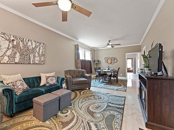 Don't miss this gem! Updates include insulated windows throughout, new sewers (2022), new gutters and downspouts (2019), furnace (2014), electric redone (2014), cement patio (2021), cement in back porch (2021), siding (2021). Full, dry, unfinished basement with flapper flood control system, New insulated windows will be installed in Fall 2024 as part of the Midway Sound Abatement Program. Beautiful turn-key single family home in the Clearing neighborhood. Abundant natural light greets you in every room. Living room seamlessly flows into the dining room with crown molding and maple hardwood floors. Kitchen has generous cabinet space, a breakfast bar, a spacious pantry. and stainless steel appliances. Additional closet under stairs. Enclosed porch leads to the second level which has 2 beds, 1 bath, a main living area with hardwood floors and can be used as an additional living space. Enjoy the outdoors on the covered front porch or in the beautifully landscaped yard and mature gardens. Detached 2-car garage. Home has been lovingly maintained and is being sold AS-IS.