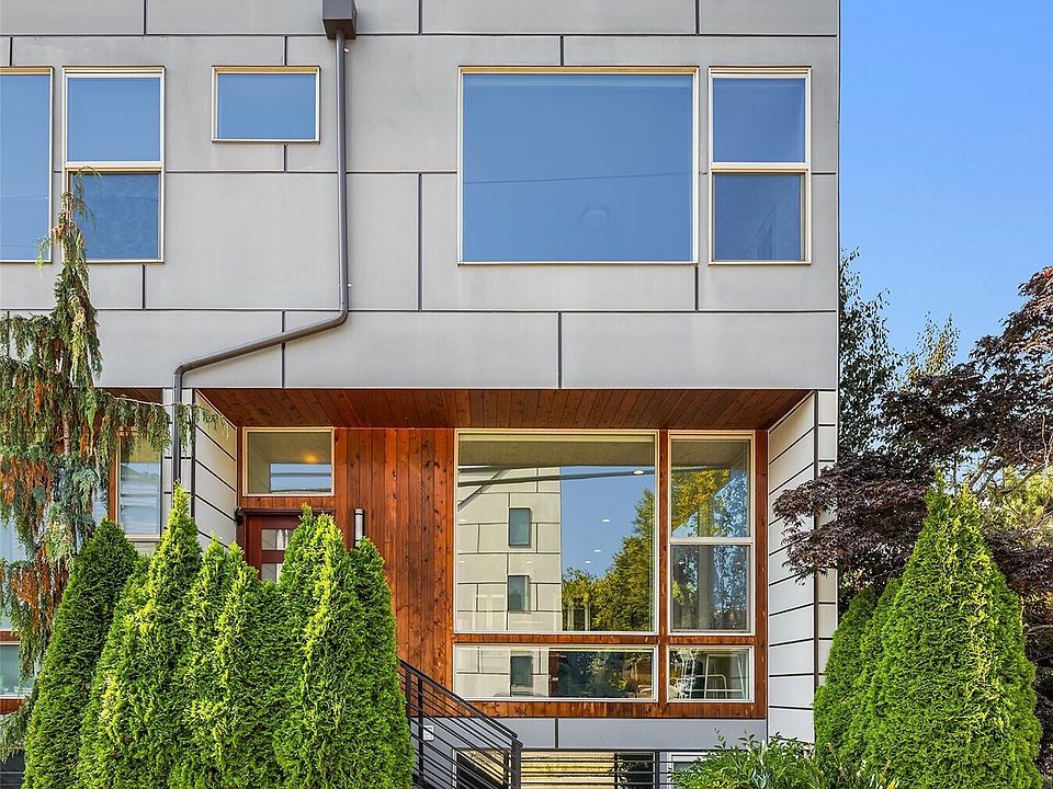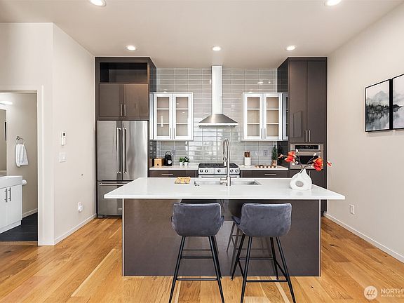 Exceptionally rare opportunity to own a townhome in Ballard with two dedicated off-street parking spots and a full ADU! The main floor entrance welcomes you into a great room with soaring ceilings and wrapped with windows. Venetian plaster accent wall surrounds the gas fireplace and the kitchen features quartz counters, gas range, custom cabinets and large island with eating space. Second level features a primary suite with spa-like bathroom including oversize walk-in shower, double sinks, and walk-in closet. Private and spacious rooftop deck with gas hookup and views of downtown. Lower level ADU is ideal for work-from-home, rental, or multi-generational living featuring full bath, kitchenette, and separate laundry. Walk score of 90!