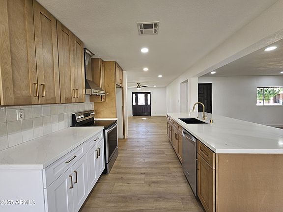 Beautifully remodeled single-story home showcasing premium finishes, contemporary design, and a sparkling pool. The front yard offers excellent curb appeal with lush grass and mature landscaping. The BRAND-NEW KITCHEN is fully updated with brand-new shaker cabinets, stainless steel appliances, quartz countertops, and a stylish breakfast bar. Enjoy the BRAND-NEW FLOORING; vinyl wood & upgraded carpet throughout the home. BRAND-NEW BATHROOMS have been upgraded with high end shower system, framed mirrors, shower niche, and custom vanities. Step out to the backyard, where you'll find a large covered patio overlooking a sparkling pool surrounded by vibrant landscaping—perfect for relaxing or entertaining.