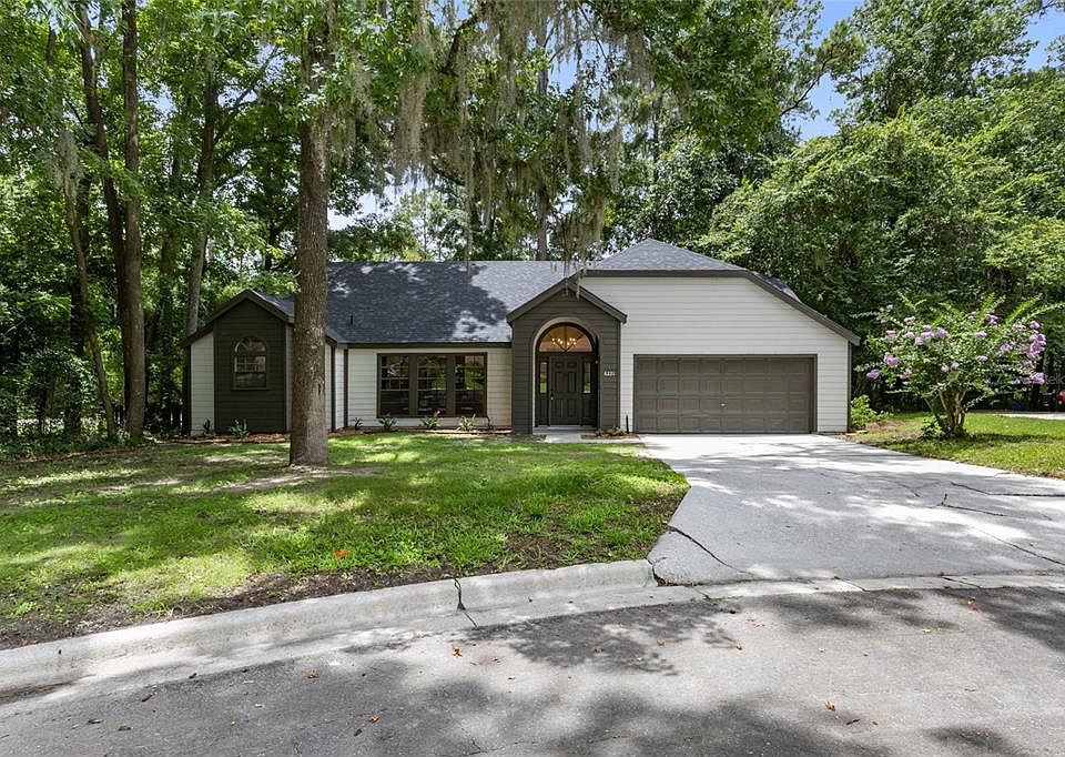 Step into this beautifully remodeled and professionally designed, no-HOA home tucked away in a quiet cul-de-sac in one of the most desirable areas of NW Gainesville! From the moment you walk in, you'll be captivated by the modern finishes, open layout, inviting natural light and LVP flooring throughout the entire home. The spacious living area, with a designed wood burning fireplace, flows seamlessly into a custom kitchen designed to host large gatherings with ease as it features a large island with quartz countertops, new stainless steel appliances, and real wood cabinets. Each bedroom offers comfort and style while both bathrooms have been fully renovated with sleek tilework and upgraded fixtures. You will be sure to fall in love with the primary bathroom as it has a walk-in shower, large soaker tub, and separate vanities. This home is located in a quiet, established neighborhood close to shopping (moments from Millhopper square), dining, parks, and UF, this move-in-ready gem combines convenience, charm, and modern comfort. This home is not only updated cosmetically but structurally as well with a new roof (2023), HVAC (2025), and water heater (2025).