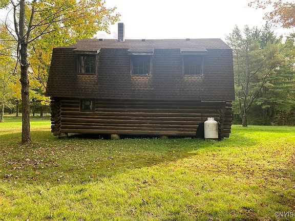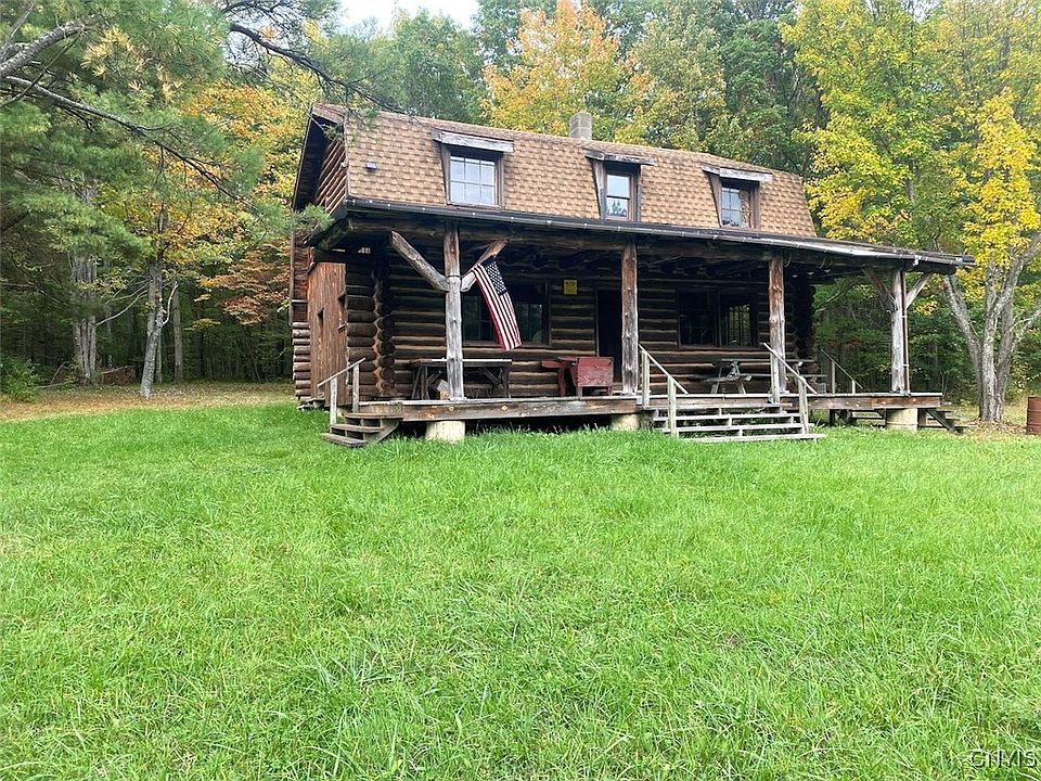 Nestled in nature and bordering state land on two sides, this secluded log home is accessible via a private, tree-lined driveway. The authentic log home, built without a kit, boasts three bedrooms and a spacious, open-concept first floor perfect for gatherings. The home also includes a roomy dining and living area with handcrafted wood stairs and iron railings leading to the second floor where three bedrooms await. One of the rooms is large enough to accommodate multiple beds. Propane lights illuminate the home while a wood stove ensures warmth for the upcoming hunting season. An outhouse is just a short walk away.
