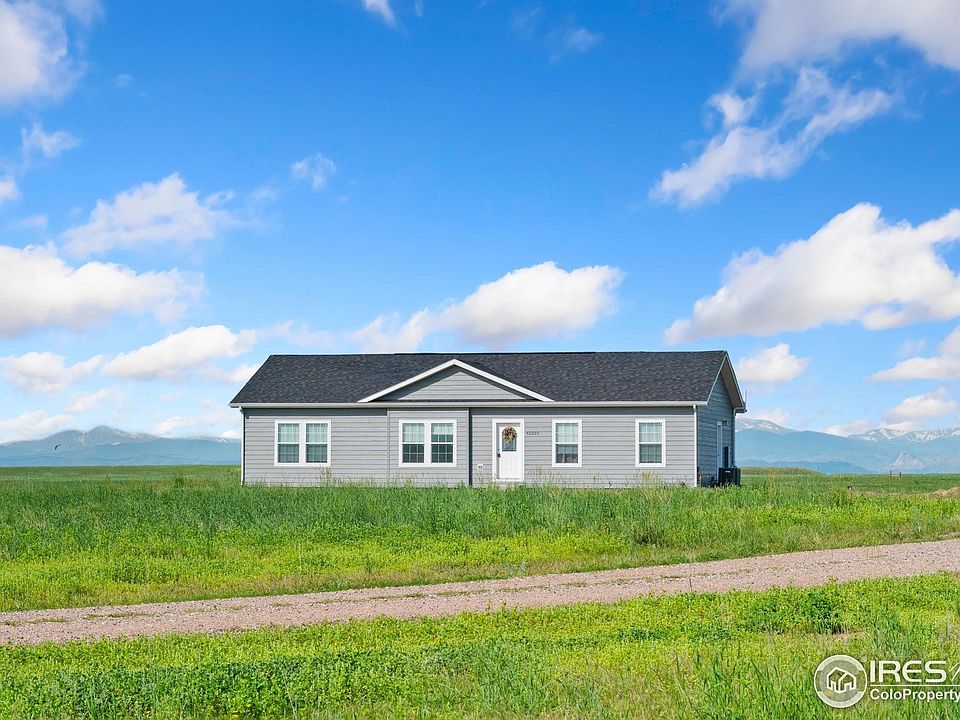 Located just off of a paved road with very easy access to I-25, this peaceful rural property enjoys eastern prairie sunrises and sunsets with a view over the beautiful back range mountains. Work from home with fiber optic high-speed internet! Incredibly high producing full-use domestic well for livestock & landscaping pumped 45 gallons per minute when it was drilled. Property also includes an 1800 gallon cistern for additional water storage. Embrace rural freedom with no HOA or covenants. This well built home features an open concept living, dining & kitchen with a large center island. All appliances included. The primary suite enjoys a massive walk-in closet and 5 piece bath with dual vanities, a spacious walk-in shower & soaking tub. Essential for country life, the huge laundry & mud room features a sink, room for a second refrigerator or freezer, and direct access to the second bathroom. Washer/Dryer included. Expand into the massive full basement with 9 foot ceilings. Central A/C. Please note, the property not yet assessed, taxes are from original purchase of vacant land. The western portion of the property is in the CRP program and expires on 9/30/2026. The southern boundary of the property is along paved CR 126, but the access is located off of CR 17, just off the paved road.