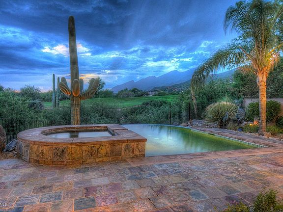 Beautiful contemporary custom home, with high 20 ft ceilings and windows with stunning vistas of Ventana Cyn golf course and the Catalina Mountains. Nicely updated kitchen, stainless appliances and granite counters open to great room. First floor master suite with den, fireplace and spa bath. Upstairs is 2 guest suites with own baths and mountain view balconies. Also on the first floor, the office, oversized laundry room, & 3 car garage. Floors are travertine and auto shades on windows. Outdoors enjoy the pool, spa, fireplace and BBQ.