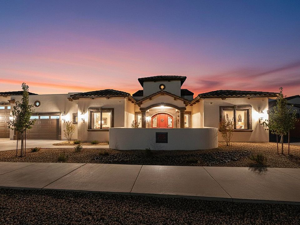 This newly built Tucson-style home is a showcase of quality craftsmanship and thoughtful design, surrounded by other luxury custom homes. The construction is truly high-end, from the solid finishes to the custom details throughout.Inside, you'll find stained and stamped concrete floors, stone ceilings in the dining room and foyer, and soaring cathedral ceilings in the living room with a kiva fireplace. French doors lead to an east-facing covered porch with ceiling fans, perfect for morning coffee or entertaining in the evenings. The gourmet kitchen is built for function and style, with a massive island that includes a sink, wine fridge, and bar seating. There are granite countertops throughout, a built-in gas stove with pot filler, and a walk-in butler's pantry with storage a