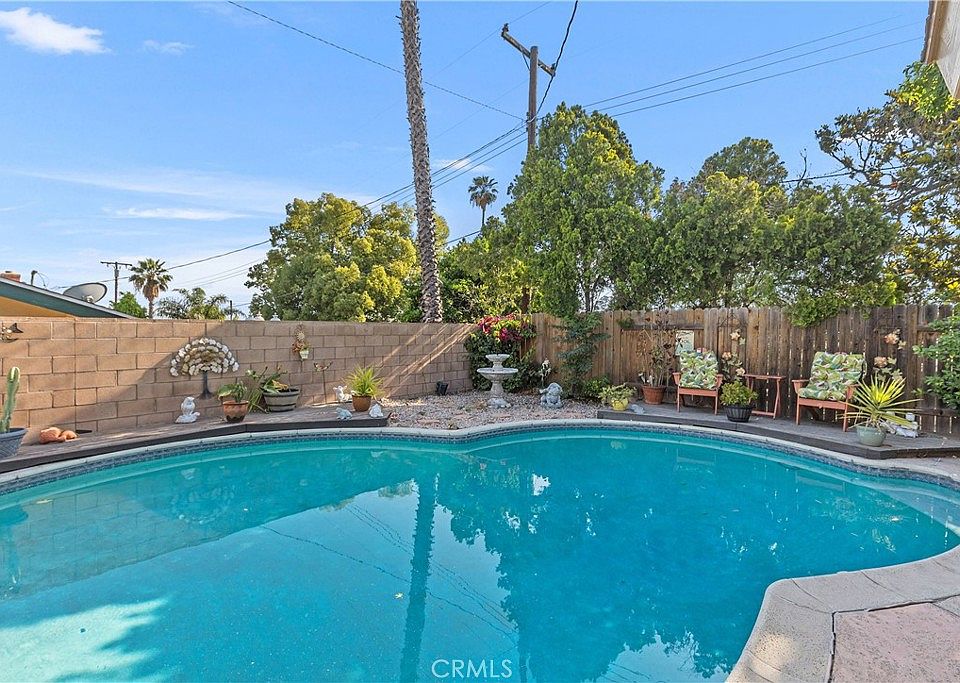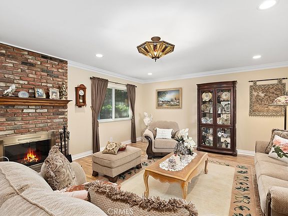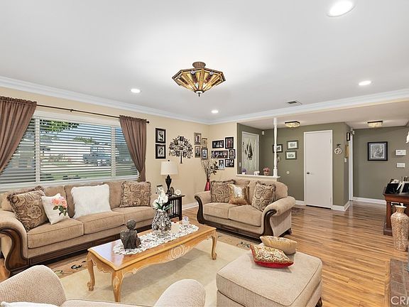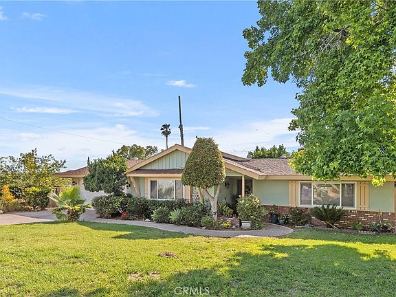 Beautiful Single Story Ranch Home with Sparkling Pool. This Cozy 3 Bedroom 2 Bath Home is full of Upgrades throughout and has a Permitted Room Addition. This home has a Large manicured Front Yard with Custom Paver Driveway and Walkway to Retro Classic Front Door which opens into a Large Open well lit Living Room with substantial Brick Fireplace. Upgrades include Newer Flooring and New Baseboards through out. Custom Crown Molding, Newer Windows, Upgraded Bathrooms, Mirrored Closets, Custom Lighting and Draperies, Whole House Water Filtration System, Reverse Osmosis System. and Can Lighting. Room Addition currently used as a Formal Dining Room, could be Sun Room. Also, a second comfortable Family Room which opens into the Galley Kitchen with Corian Counters and Eat In Breakfast Nook with Built in Buffet. Home and 2 Car Insulated Garage have ample Storage. Back Yard boasts Large In Ground Swimming Pool and Kidde Pool. Garden Area off Room Addition and Rear Shady Green Grass Area at back of house for Flowers or Garden. Area boasts Shopping, Restaurants, Entertainment and near San Manuel Casino.
