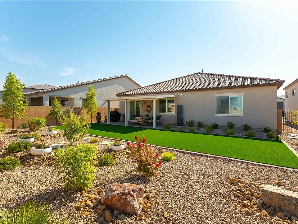 Modern cooktopDesert landscapingDouble sinksCovered patioBuilt-in ovenArtificial grassBeautiful quartz counters