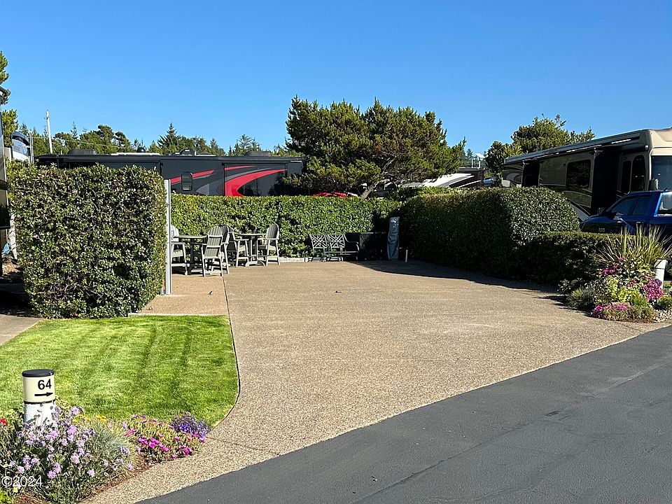 Beautiful back in lot; all around expanded pads; removable privacy fence also blocks the light wind; tall hedges; beautiful outdoor furnitures are included in the sale as is condition; seasonal ocean view. Pacific Shores Motorcoach Resort is located on a bluff overlooking the ocean and has a lighthouse view. Nature walking trails through the wood and access to an uncrowded beach. A large clubhouse and owner's only lounge, gym and kitchen. Indoor/outdoor pools and spas and hot sauna.