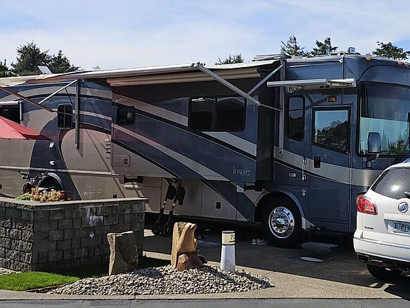 Welcome to Pacific Shores! Come call this beautiful back in lot yours at this gorgeous ocean front resort. With the coach angled to act as a wind screen, you get a wonderful barrier from the coastal breeze, and a protected expanded patio that feels warmer than beyond. This lot includes a well built block privacy wall, an outdoor prep counter, and an adorable wood carved seal! The resort offers private beach access, waking trails, a pickleball court, indoor and outdoor pools and spas, and multiple saunas, in addition to owners only access lounge, kitchen and gym.