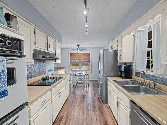 Double ovensHuge park-like fenced backyardFresh paintNewer roofMasonry fireplaceDouble garageEat in kitchen