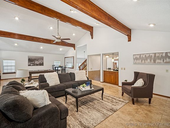 Set behind a gated entry in serene Mill Creek Pond, featuring a peaceful lake near the entry. Located on a cul-de-sac with a large backyard and patio. The great room is perfect for winding down or entertaining with a cathedral ceiling, gorgeous wood beams, and an entertainment area currently furnished with a billiards table. Enjoy cooking in the large kitchen, complete with granite countertops, wood-stained cabinetry, and a spacious informal dining area. A private half-level den leads to a luxurious master suite boasting multiple closets, a soaking tub, and a walk-in tiled shower. Three guest bedrooms upstairs, one opening to an upper balcony that enjoys stairs to the backyard.