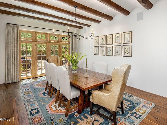 Timeless beauty in Paradise Valley's most sought after gated neighborhood, Finisterre. Completely remodeled in 2019 & dazzling with charm and elegance, this exquisite home will captivate you from the moment you pull into the circular driveway & walk through the custom iron gate into your own personal desert oasis. Every detail of this property will enchant you with the walnut flooring, barrel ceilings, 4 gas fireplaces, abundance of natural light & designer finishes. Gourmet kitchen with two tone counter tops, Wolf Range, Sub-Zero fridge and freezer, Miele coffee maker and two Asko dishwashers plus tons of storage and a butler's pantry. Bonus room off the kitchen makes for a wonderful play room or office. The home has 4 en-suite bedrooms in the main house plus an attached guest suite and a detached guest house totaling 6 bedrooms. Primary suite boasts a quaint sitting room, an exercise room, oversized clothing closet and a spa-like bathroom. The home is surrounded by a peaceful courtyard and lush mature vegetation. Sparkling pool and jacuzzi with breathtaking mountain views of both Camelback and Mummy Mountain. You won't find another home like this in the entire Valley!