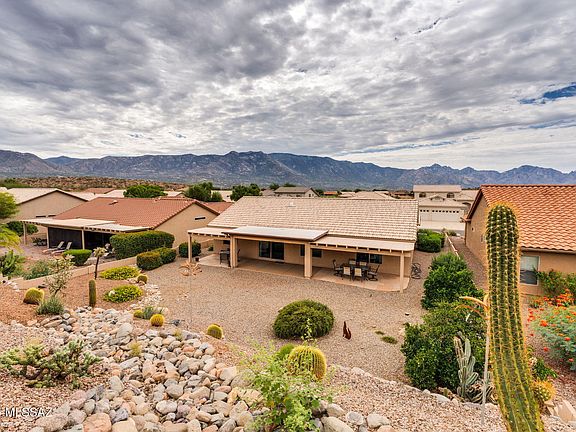 Charming Laredo plan resides on a spacious lot offering front Catalina views. New Roof Underlayment (2024), Windows (2019), HVAC/Water Heater (2015). Epoxy drive/walkway flows to Courtyard with Stone Cactus Water Feature. Enter to find an open concept plan with soaring vaulted ceilings, rear patio slider, plantation shutters and solar tubes. Kitchen hosts Granite counters, Stainless appliances, Island & Dining Nook. Primary suite offers Granite dual sink vanity, custom walk-in shower & closet. Built-in workstation in Den with Views. Guest Room with Views accesses hall bath. Laundry Room with cabinets and Extended 2-Car Garage with Utility Sink/Cabinets. Rear covered patio has Pergolas at each end for added shade. Pristine Landscape with 2 Orange Trees. SaddleBrooke Active Adult Community.