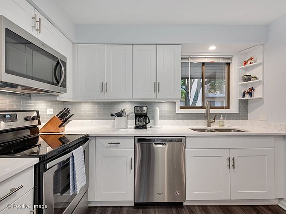 Oh-so-stylish renovation of a 2 bed/2bath condo in an extremely well maintained, classically designed California style courtyard building in a prime Norwood Park location. Situated on a tree-lined side street blocks to Edison Park, this top floor, move in ready home boasts an open floor plan with a 25' long balcony that runs the width of the condo. The kitchen is classic chic outfitted with premium white cabinets, white quartz countertops, subway glass tile backsplash, a peninsula island and stainless steel appliances. The baths were also completely redone with stone finishes and stylishly appointed. The main bedroom suite can easily accommodate a king sized bed and dressers and features a stunning bath, two side by side closets and a sliding glass door that leads to the balcony. The combined living room/dining room space also has a sliding glass door to the balcony, recessed lighting and is generously sized to accommodate both living room and dining room furniture. The second bedroom is adequately sized for a variety of uses with a large closet and a view of the courtyard. There's in unit central heating/AC, an assigned parking space on site, additional storage and a laundry room in the building. Ideally located a block from the Metra stop and all things Norwood Park - shops, library and Onahan Elementary School. Minutes to Edison Park dining and nightlife, close to Park Ridge, Trader Joe's, Whole Foods and a short trip to O'hare and Jefferson Pk transit. A rare opportunity to own one of the nicest renovated condos in this well maintained building with an association vested in long term planning with reserve studies and proper care. There is currently $209k+ in reserves.