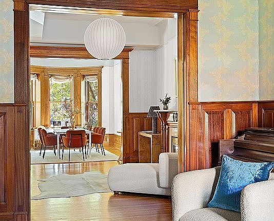 Up the center staircase, with its beautiful woodwork, you will find a south-facing primary suite, also with a bay window. The bath was completed less than 2 years ago and features heated floors and marble surfaces. In the rear of the house is another bedroom (currently used as a den) with a wood-burning fireplace and another full bath. The windows in the primary bedroom have been replaced.