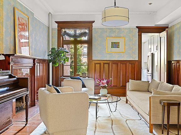 Built in 1902, the limestone facade gleams and invites you up a rebuilt stoop. The parlor floor offers a formal dining room with a bay window, a center parlor with a gas fireplace, a large living room with a wood-burning fireplace, and a spacious, renovated kitchen overlooking the garden. Original parquet floors have been restored, and every window on this floor has been replaced.