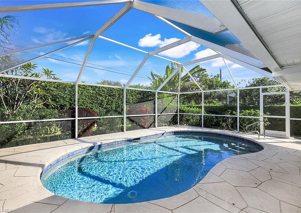 This well-maintained, beautiful POOL home, in the high and dry 600 block, is ready for you - as its new resident or vacation rental investor! This home exudes a relaxed, oasis vibe. The private lanai lends itself to quality time with loved ones, with a resurfaced pool and room for a bar or outdoor kitchen! Enjoy your morning coffee or adult refreshments at sunset on the screened front porch. Stepping inside, the living room provides a central space for entertaining. Expansive counter space in the kitchen is perfect for the chef-at-heart! Barstools at the island allow for some company in the kitchen or the little chef assistant! The master suite boasts serene views of your outdoor oasis. Guests will enjoy a bedroom and fully enclosed den, which can easily be used as a third bedroom. Walls of lush tropical vegetation and a well-manicured lawn, add to the Florida ambiance. The seller has taken the utmost care of this home and made valuable improvements. A brand NEW ROOF is being installed. All plumbing, in addition to the water heater, was replaced in 2024. Vanderbilt Beach, Delnor Wiggins State Park, shopping, countless restaurants and Mercato, are within walking/biking distance. Start living your best Naples life today!