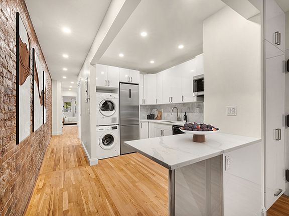 Stainless kitchen with dishwasherPrivate bricked backyardExposed brickWasher and dryerBreakfast barBrand new wood floors