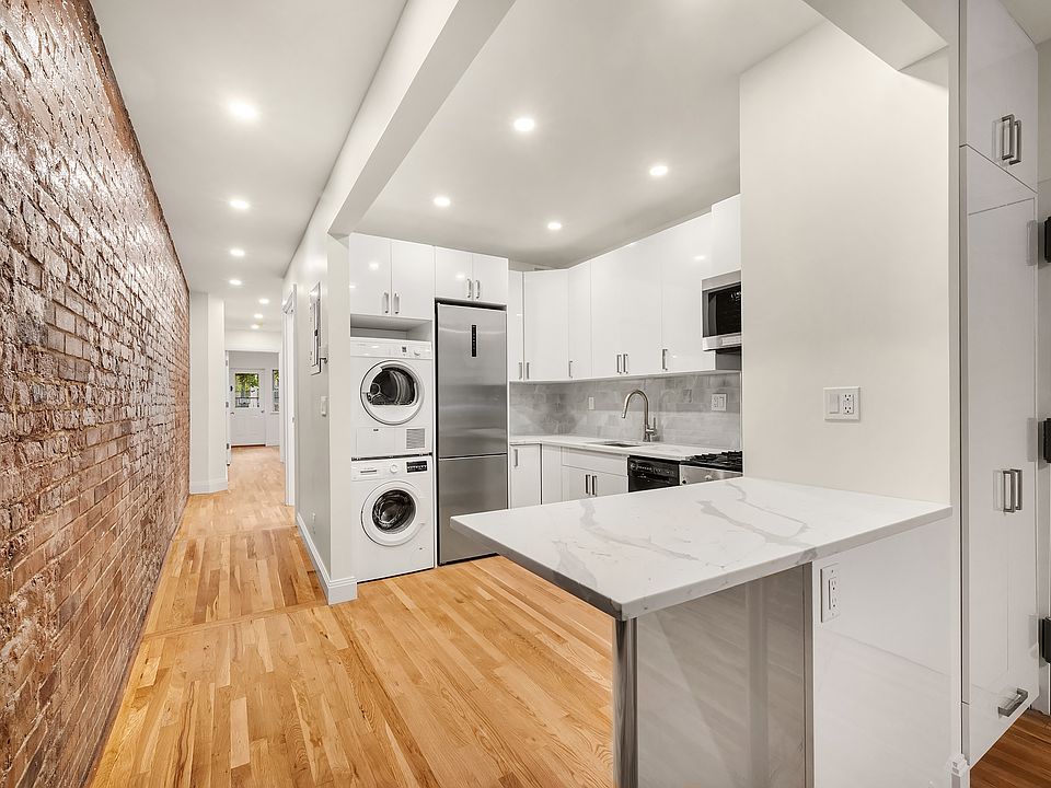 Stainless kitchen with dishwasherPrivate bricked backyardExposed brickWasher and dryerBreakfast barBrand new wood floors