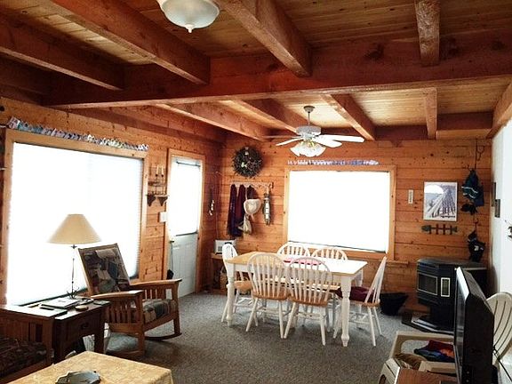 This one is hard to beat, character and quality! Beautiful, immaculate, D-Log cabin in the woods within walking distance to town and lake. 2 bedroom 2 bath, large storage off of covered carport, lots of room to add on if desired. Established neighborhood. Covered porches abound, perfect for relaxing in the summer or winter months. Vaulted ceilings with exposed beam work and tongue and groove ceilings add a lot of charm and character to this home. Pellet stove makes heating easy and affordable. This one is hard to beat, character and quality!
