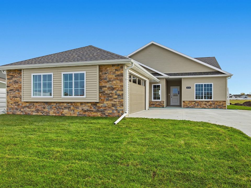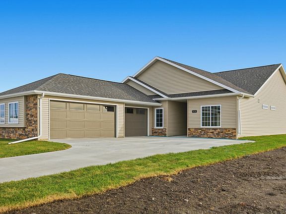 NO STEPS 1-level Tucson floorplan with sun room and covered patio! Brand NEW, just completed November 1, 2025, this 3 bed, 2 bath single-level 1800(A)sqft home is "Just Right"! You’ll love the bright-and-open 4season Sun Room that leads out to a coveted, covered patio - the perfect retreat: protected from wind on 3 sides and sheltered from the hot afternoon sun in the afternoons. The open kitchen features a pantry, soft-close cabinetry, deep pots-n-pans drawers, quartz countertops, tile backsplash, and a raised dishwasher (a real back saver!). Beautiful primary bedroom suite with spacious bathroom with step-in shower and a generous walk-in closet. Across the house, a 2nd bathroom (with extra-wide soaking tub) and 2 more bedrooms provide flexibility: there's space for a TV den or craft room, or an office... your choice! The 3-stall garage is insulated and sheetrocked, and roomy too! Great for storage or a workbench. No steps inside or out, and lawn care and snow removal handled by a small HOA— just $135/mo. Pets allowed! All ages welcome! Come take a look!