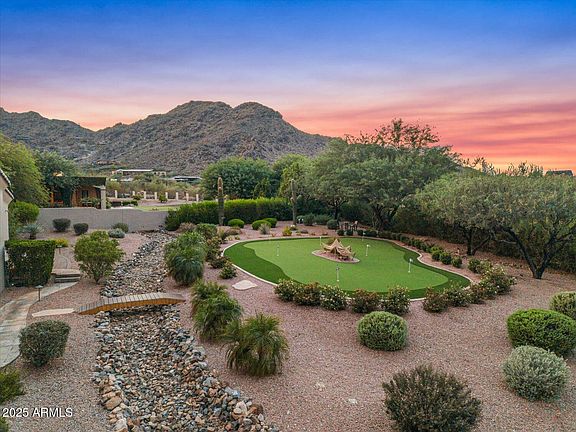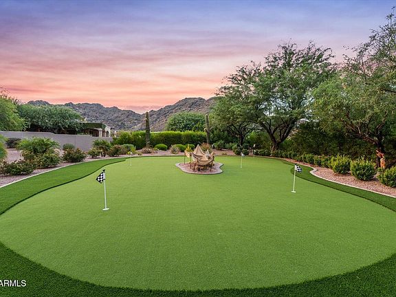 Welcome to luxury living in the heart of Paradise Valley's prestigious 85253. This fully furnished estate offers sweeping 280-degree views of Mummy Mountain, Pinnacle Peak, the McDowells, and glittering city lights. Impeccably maintained, the home has just been refreshed with new interior and exterior paint, a brand-new roof, all-new exterior deck, and even a private putting green. A grand entry with dramatic ceilings and elegant walnut and stone flooring leads to expansive living spaces, including a family room, billiards room, two wet bars, butler's pantry, and five cozy gas fireplaces.