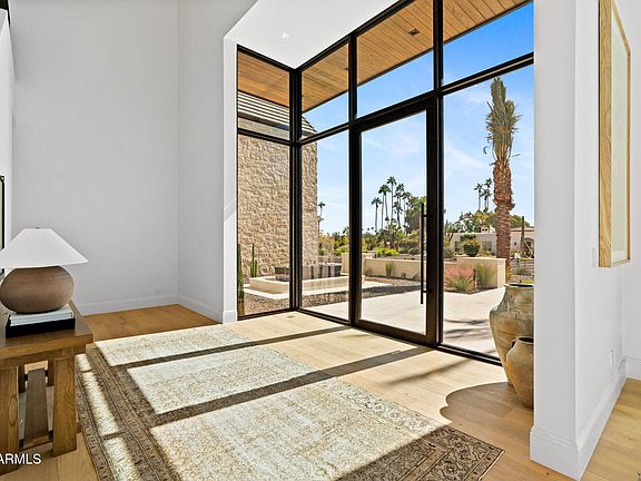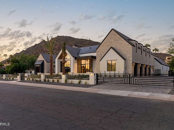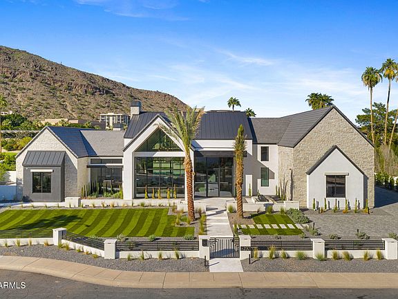 This privately gated custom estate, ideally located between Arcadia Proper and Paradise Valley in the prestigious Hopi School District, blends modern design with resort-style amenities. Inside, an impressive kitchen with a full back kitchen and pantry anchors the home, complemented by five en-suite bedrooms, a guest suite, office, fitness room, and pool house—balancing elegance with function. Outdoors, a sparkling oversized pool and spa, covered cabana, sunken firepit, and full sand volleyball court create a true resort retreat. Mature palms frame the property, while unobstructed Camelback Mountain views provide a striking backdrop. A spacious four-car garage and private motor court complete this rare Scottsdale offering.