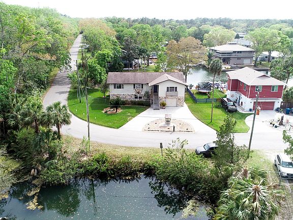 Welcome to Paradise! Perfectly situated on an oversized corner lot awaits this 3 bedroom 2.5 bathroom home with 95 ft of waterfrontage with direct Gulf access. This meticulously maintained, original owner home in Palm Grove Colony, offers generous living space and water views on 2 sides of the home. Enter through the front door and discover an open concept floorplan with built-in bookshelves and cedar details throughout the house. The kitchen has solid wood cabinetry with butcher block countertops and a corner eat-in nook with storage in the bench seats. Enjoy the extended screened porch and watch the fish jump and manatee swim by. The master suite is grand and boasts a large picture window with a Northern spring-fed water view and a huge cedar-lined walk in closet. The office is oversized with a cedar lined ceiling and closet. Downstairs you will discover a 2 car tandem garage and a massive 28x37 workshop which could also be used as indoor/outdoor entertaining space. The open-air back porch and pavered patio are the perfect spots to relax and enjoy the Florida lifestyle. The side yard is fenced for pets, there is an irrigation system with new sprinkler heads and control panel and mature landscaping, Other features include cedar lined closets in all bedrooms, 2 hot water heaters, double paned windows, double insulation, and dedicated space to install an elevator and a dumbwaiter, if you so choose. The house is being sold mostly furnished, so pack your toothbrush and enjoy all this lovely home has to offer!