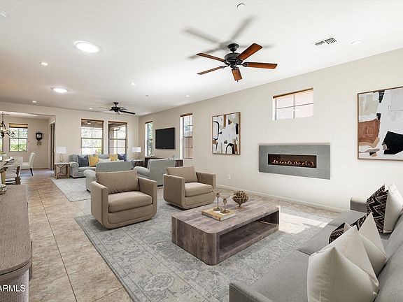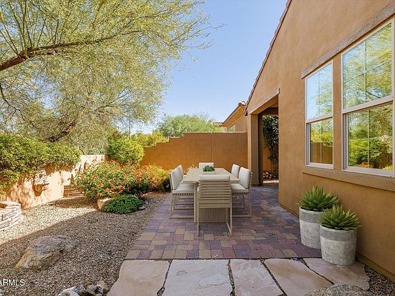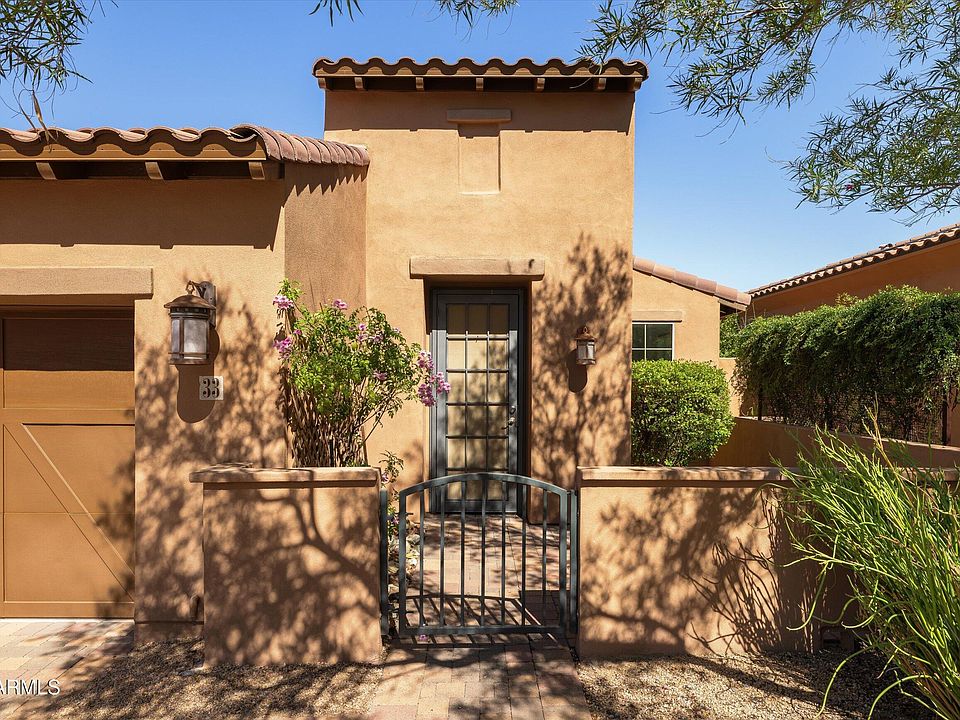 This is the perfect ''lock in leave'' home in a prime Cave Creek location . . . walk to shops & restaurants. This meticulously cared for residence offers a desirable single level floor plan with no interior steps. The well-appointed kitchen is the heart of the home & features a center island, granite countertops, stainless steel appliances with gas range, and custom cabinetry. The great room offers an electric fireplace and the dining area features a double glass doors leading to a covered patio and lush private garden. The primary suite is split & includes an ensuite bath with dual vanities, walk-in shower and closet. There is a small bonus room that makes a great craft room/office. Community amenities include pool, spa, BBQ, outdoor fireplace & a clubhouse with a fitness and party room.