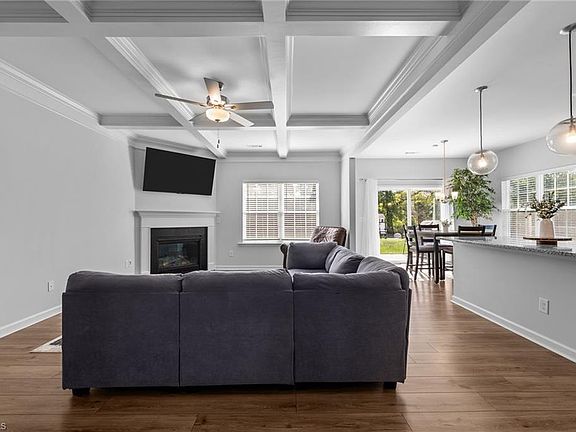 Gas fireplaceLush green grassCoffered ceilingsLuxury detailsLarge lotFully fenced backyardPendant lighting