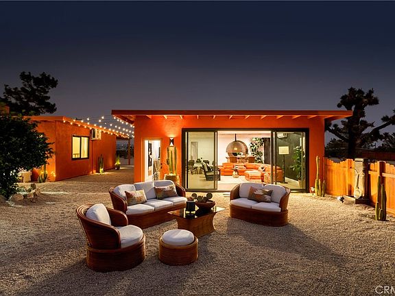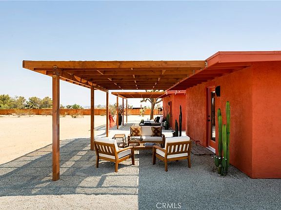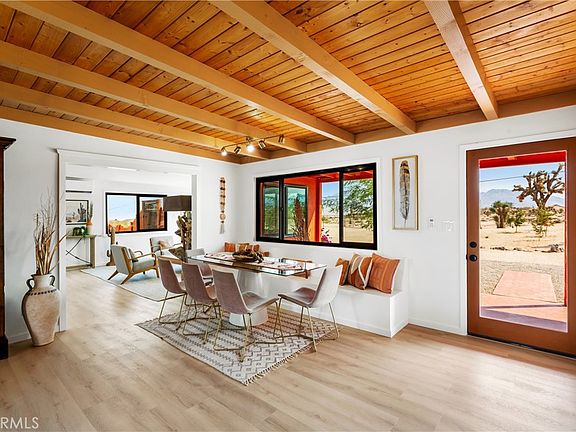 Experience serene desert living in this beautifully remodeled mid-century home, offered partially furnished, with exceptional short-term rental income potential. Just minutes from downtown Joshua Tree and the National Park entrance, this 2.5-acre fully fenced property boasts stunning 360-degree views of the National Park ridgeline and twinkling town lights. The updated home features an open-concept living space with energy-efficient windows that flood the interiors with natural light and frame breathtaking vistas. The private primary suite includes a walk-in closet and a luxurious en-suite bath with jade onyx porcelain, a soaking tub, and a walk-in shower. Sophisticated design details, like Venetian plaster, create a tranquil and stylish atmosphere. Outdoor spaces are perfect for entertaining or relaxation, with a zen garden, an oversized flex room, three pergolas, a backyard dry bar, a jacuzzi for ultimate unwinding, and a geodome for stargazing. Fully irrigated landscaping with fruit trees and mature cacti completes this desert retreat. Ideal as a primary home, second home, or income-generating short-term rental, this property combines versatility and charm. Request the inclusion/exclusion list for furnished items. Located off a paved road, this home offers the perfect Joshua Tree escape.