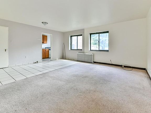 This apartment has all cream white tile which is easy to clean and brightens the room. The kitchen is service-only, but features a lot of cabinets and a dishwasher. The bedrooms have comfortable beige carpeting.