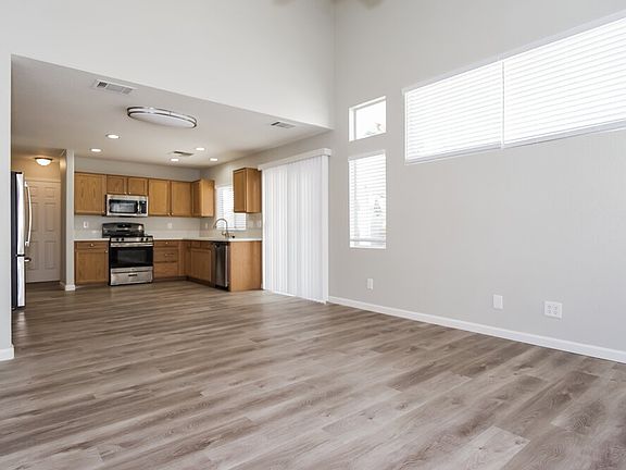 This newly renovated Las Vegas rental home includes an attached two-car garage and a covered front porch. The interior boasts an open floor plan, complete with vinyl plank flooring and vaulted ceilings. The fenced-in backyard contains a covered cement patio with glass doors allowing you to enter the kitchen. This beautiful and functional area contains a walk-in pantry, dark wood cabinetry, quartz countertops, and stainless-steel appliances. The spacious living room features plenty of windows for natural light and a lovely staircase leading up to the second floor, where you will find the comfortable master bedroom that overlooks the backyard. The adjacent bathroom offers dual vanity sinks, a huge walk-in wardrobe, and an oversized tub. Schedule a tour today.