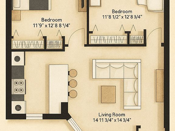 Two equal-sized bedrooms, each large enough to fit a queen or king bed plus additional furniture