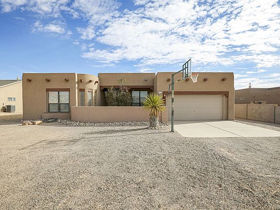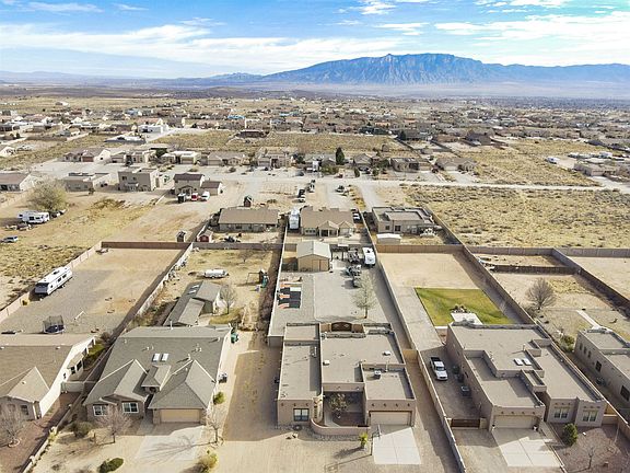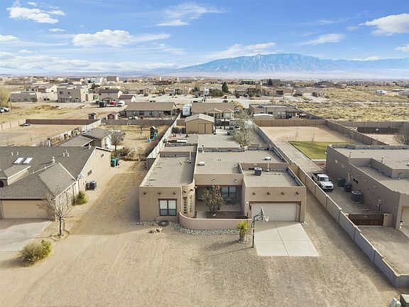 Custom Wallen southwest style home located in Rio Rancho Estates on a half acre! Gated courtyard entry. Large living area with exposed wood beams, wood burning fireplace. Kitchen hosts upgraded cabinets, corian counters, built-in oven, cook top.. Great master suite with a double sided fireplace and a walk-in closet. Secondary bedrooms separated by jack-and-jill bath with dual sinks. 4th bed doubles as multi-purpose room/office/guest room. Beautiful covered patio with mountain views and a custom gate leads to large (appx 825 sq ft) detached garage,/workshop (with power) and a car lift. . This is a must see